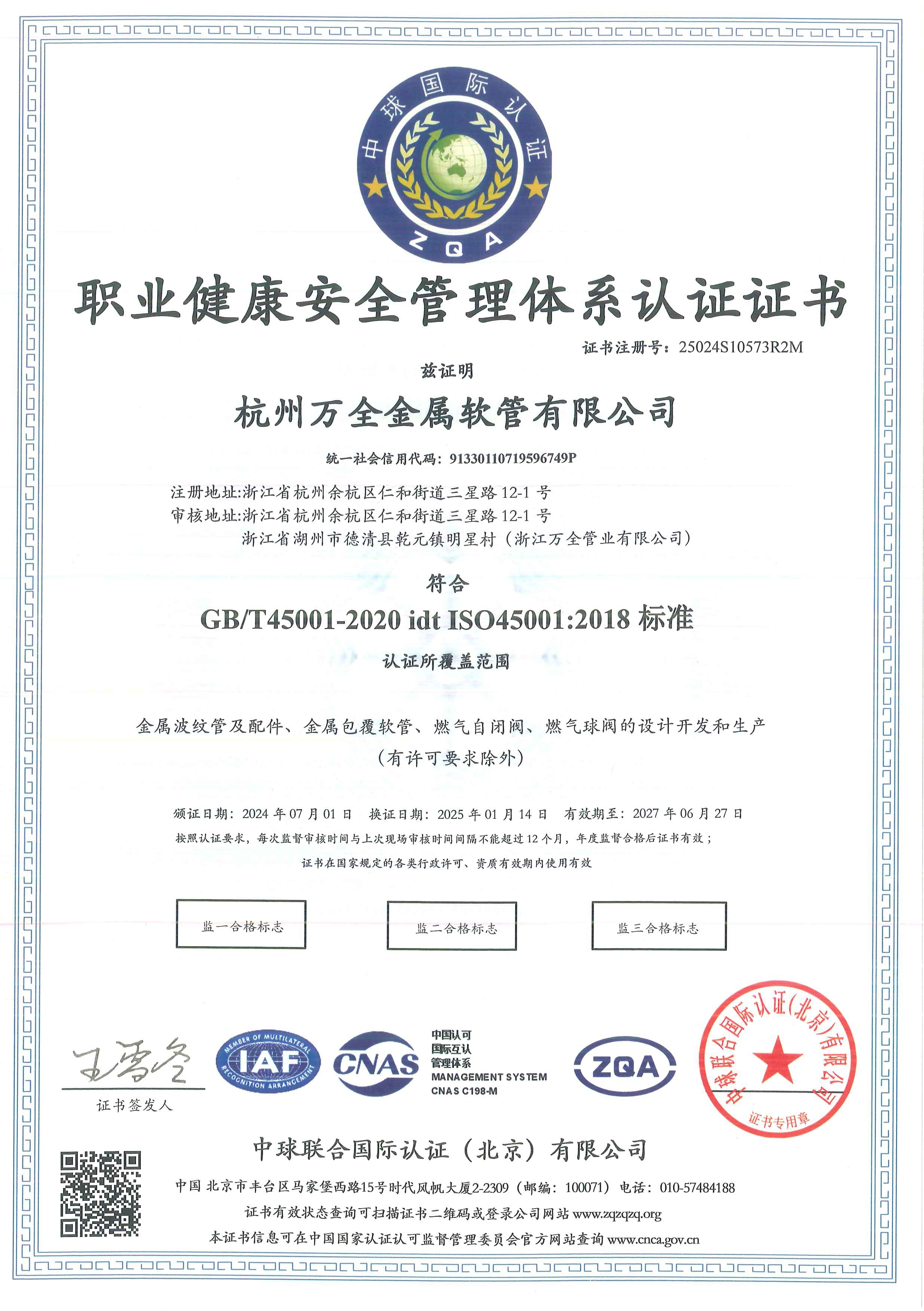 ISO45001职业健康安全管理体系认证证书