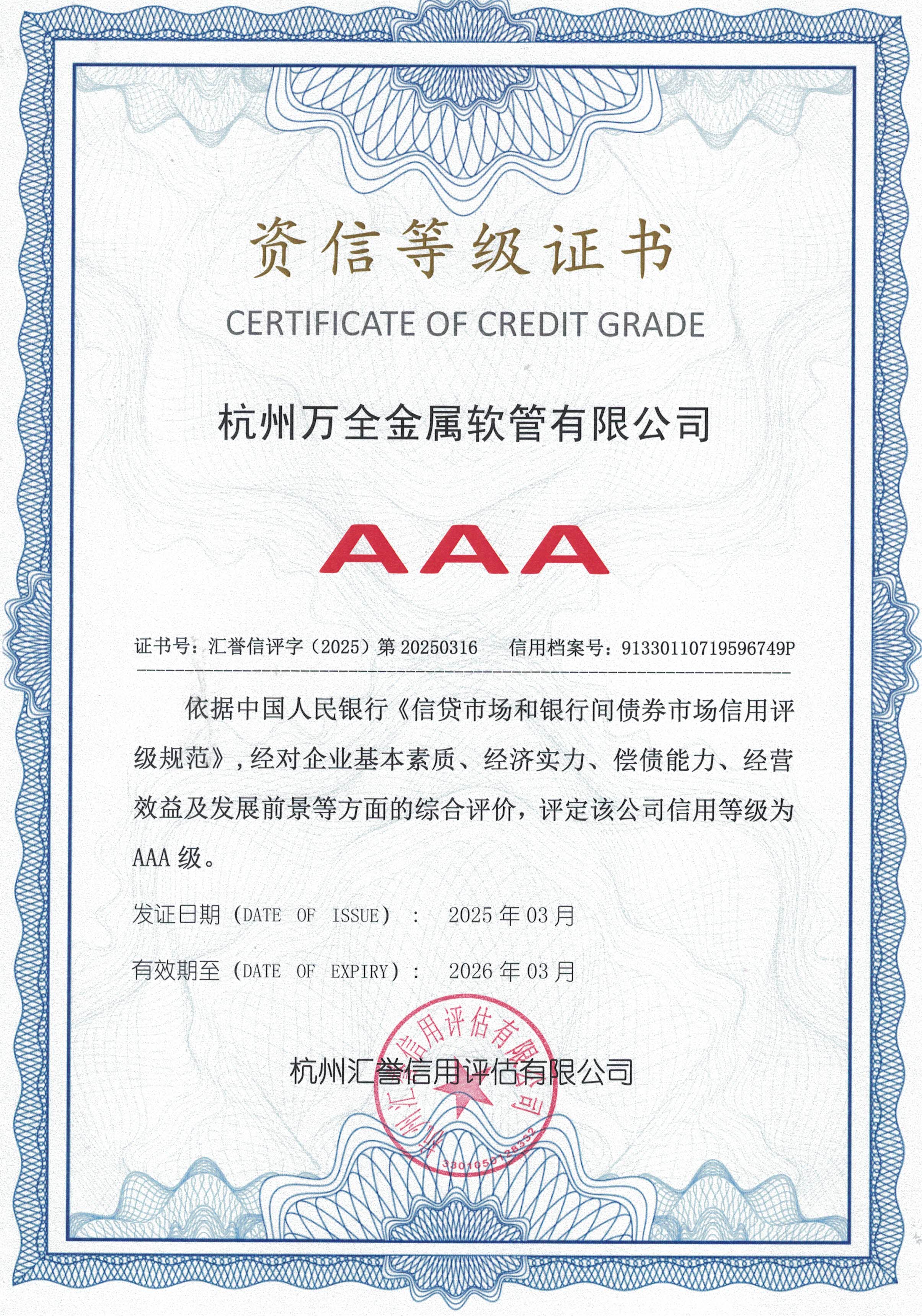 AAA资信等级证书