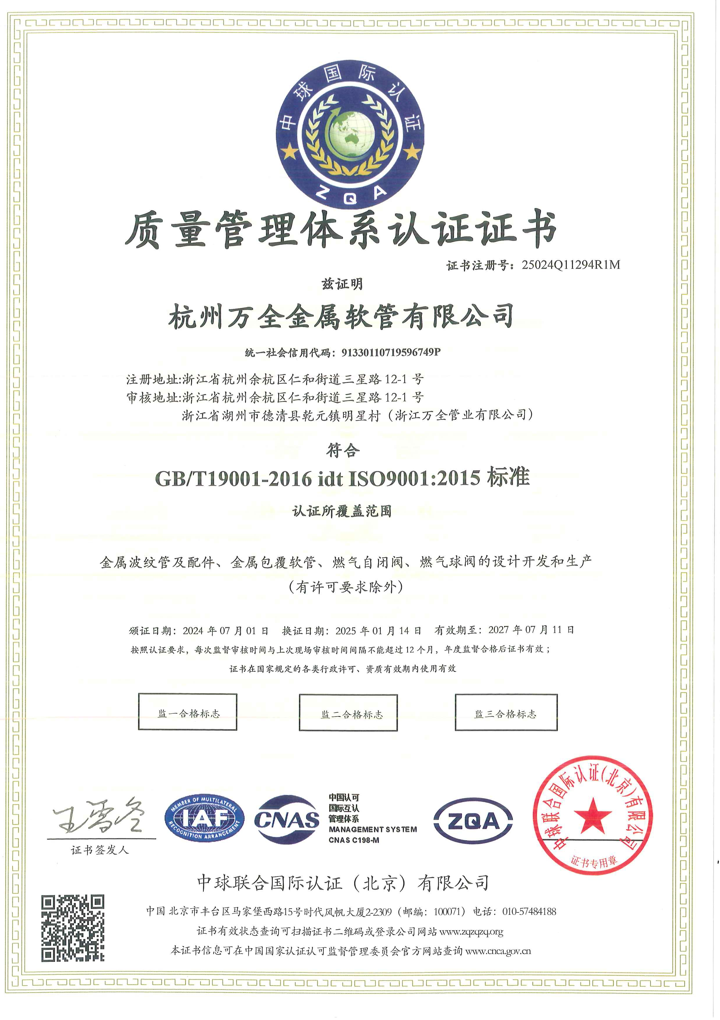 ISO9001质量管理体系认证证书